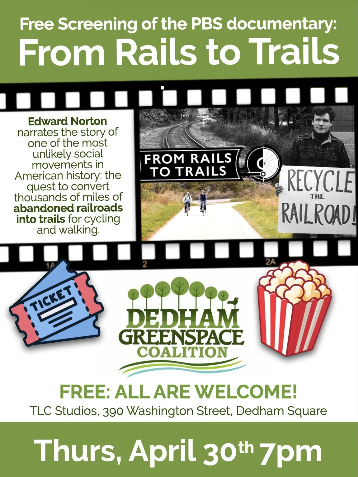 The Dedham Greenspace Coalition (DGC) invites community members of all ages to a special free screening of the acclaimed PBS documentary From Rails to Trails on Thursday, April 30 at 7:00 PM at TLC Studios, 390 Washington Street, Dedham Square, MA.
